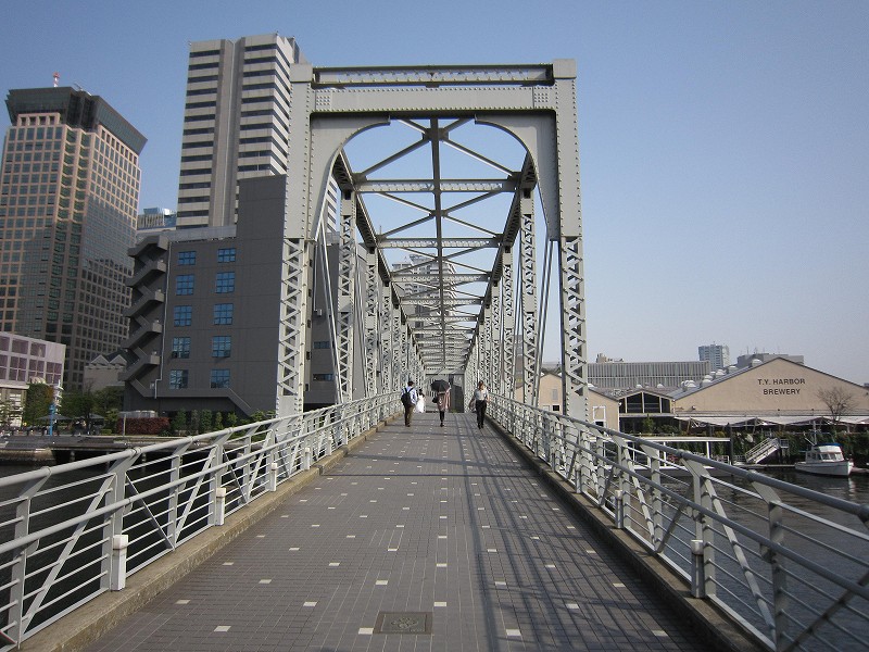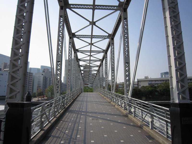 歩行者専用の人道橋で「天王洲ふれあい橋」といいます。 橋工学的には、ちょっと変わった構造で、その手のマニアの人には有名な橋だそうです。 |